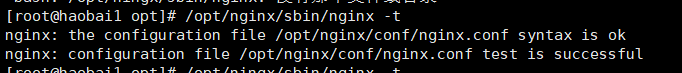 配置測試: /opt/nginx/sbin/nginx -t 出現如下界面說明配置沒問題