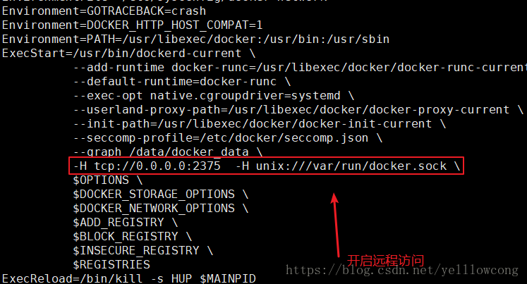 打開/usr/lib/systemd/system/docker.service文件,修改ExecStart這行。