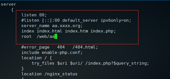 如果我們想綁定多個域名怎么辦,或者是各種二級域名,比如hao.、tools.這樣的二級域名;首先還是將域名解析到服務(wù)器,然后整體復制上面server{}代碼段重復粘貼到下面即可,這樣構(gòu)造出多個server就是多站點配置了,注意要復制全,大括號要對稱,并且shell腳本中大括號和前面的語句之間必須有空格或者換行,這個很重要比如server { 或者if () {等一定要注意,其他的都很容易理解;當然很多集成包中會在和配置文件nginx.conf同目錄下設(shè)置一個vhost這樣的代碼虛擬主機的目錄,對于綁定多個域名設(shè)置多個配置文件,比如aa.conf、bb.conf這些文件,然后在nginx.conf使用include vhost/*.conf;全部引入,引入相當于所有代碼寫在nginx.conf中一樣,并且不用考慮其他目錄的關(guān)系,都以nginx.conf為準,這樣方便管理,比如aa.conf;