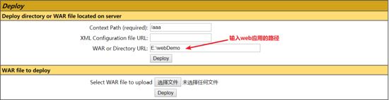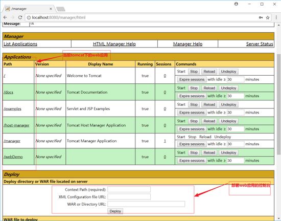 控制臺下方的Deploy區(qū)用于部署web應用。tomcat提供兩種方式部署web應用:一種是將整個路徑部署成web應用;另一種是將war文件部署成web應用