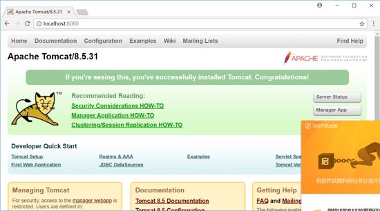 配置好之后我們就可以正常打開tomcat了,雙擊startup.bat,tomcat正常啟動。啟動完成后,我們在瀏覽器地址欄上輸入:http://localhost:8080,會得到以下的界面