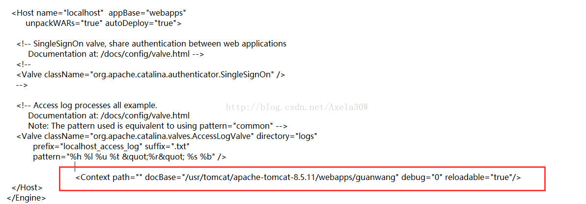 <Context path="" docBase="/usr/tomcat/apache-tomcat-8.5.11/webapps/guanwang" debug="0" reloadable="true"/>