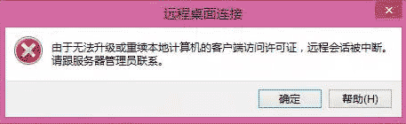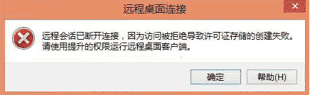 并不能解決問題,之后出現(xiàn)了新的錯誤提示,如第二個圖:“遠(yuǎn)程會話已斷開連接,因?yàn)樵L問被拒絕導(dǎo)致許可證存儲的創(chuàng)建失敗。請使用提升的權(quán)限運(yùn)行遠(yuǎn)程桌面客戶端?!?/p>