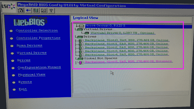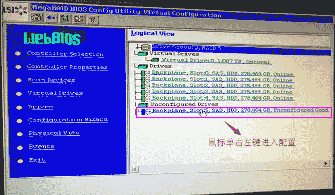 25、另外最后一塊硬盤做RAID5的熱備盤,鼠標(biāo)單擊Slot 5硬盤進(jìn)入配置