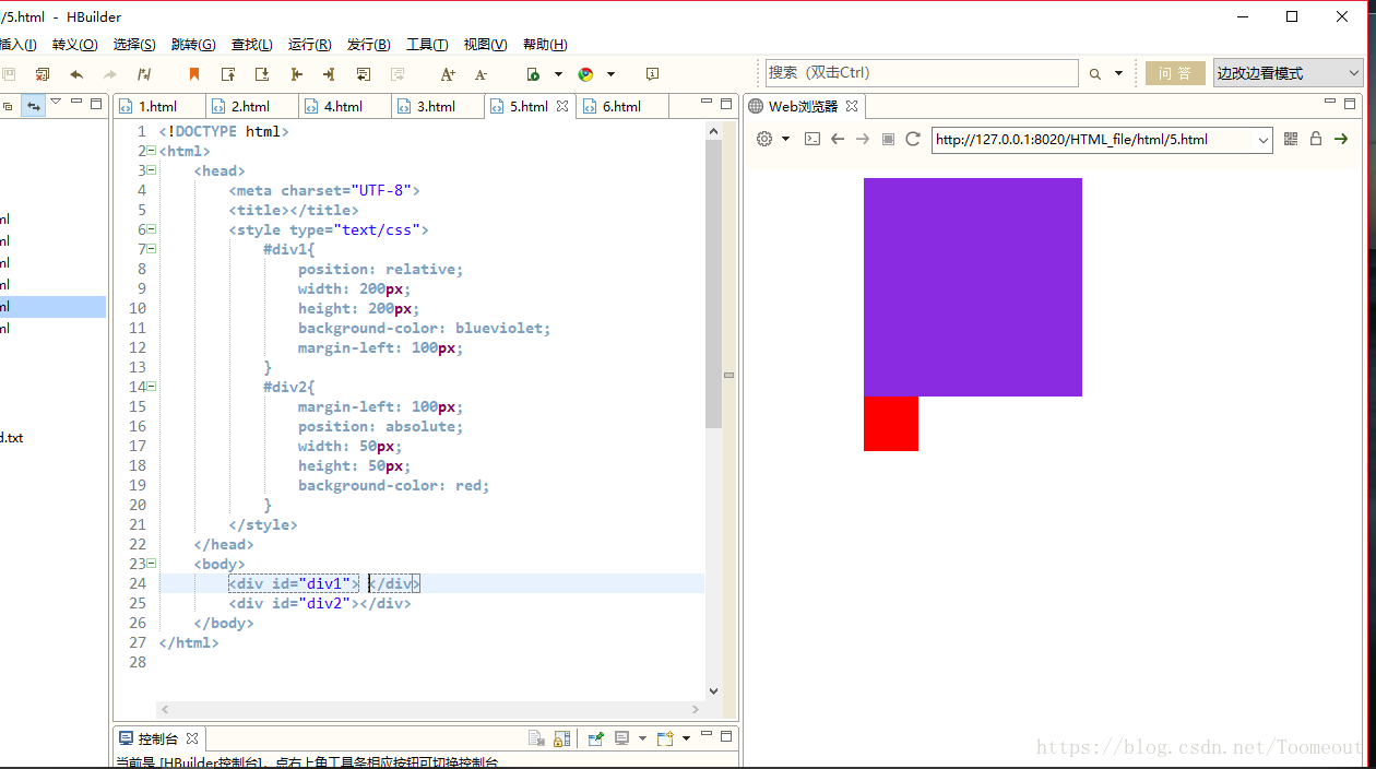 以上這種情況將div1的position設(shè)置為relative相對(duì)位置,可以看出小方塊會(huì)緊接著大方塊也就是小方塊是相對(duì)于大方塊來(lái)的也就是relative:相對(duì)定位元素的定位不允許元素的重疊,俗話就是通過(guò)relative說(shuō)這個(gè)位置我已經(jīng)占了你只有站我下個(gè)位置了,當(dāng)我們把大方塊的改成絕對(duì)位置absolute