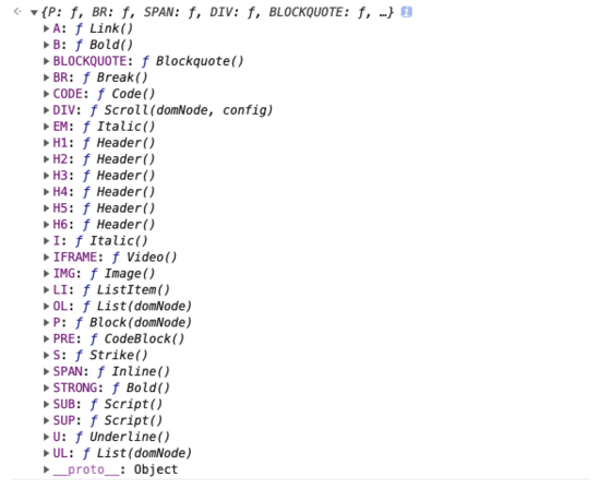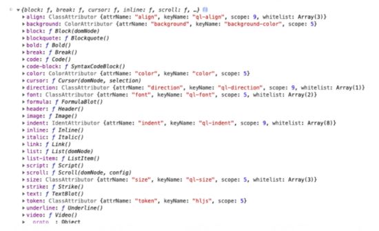 這其中常見的包括TextBlot(行內(nèi)普通文本)、Inline(行內(nèi)攜帶樣式的普通文本)、Block(塊級行,一般以段落p為單位)、Break(換行)、Image(圖片IMG插入)、Bold(加粗文本)。