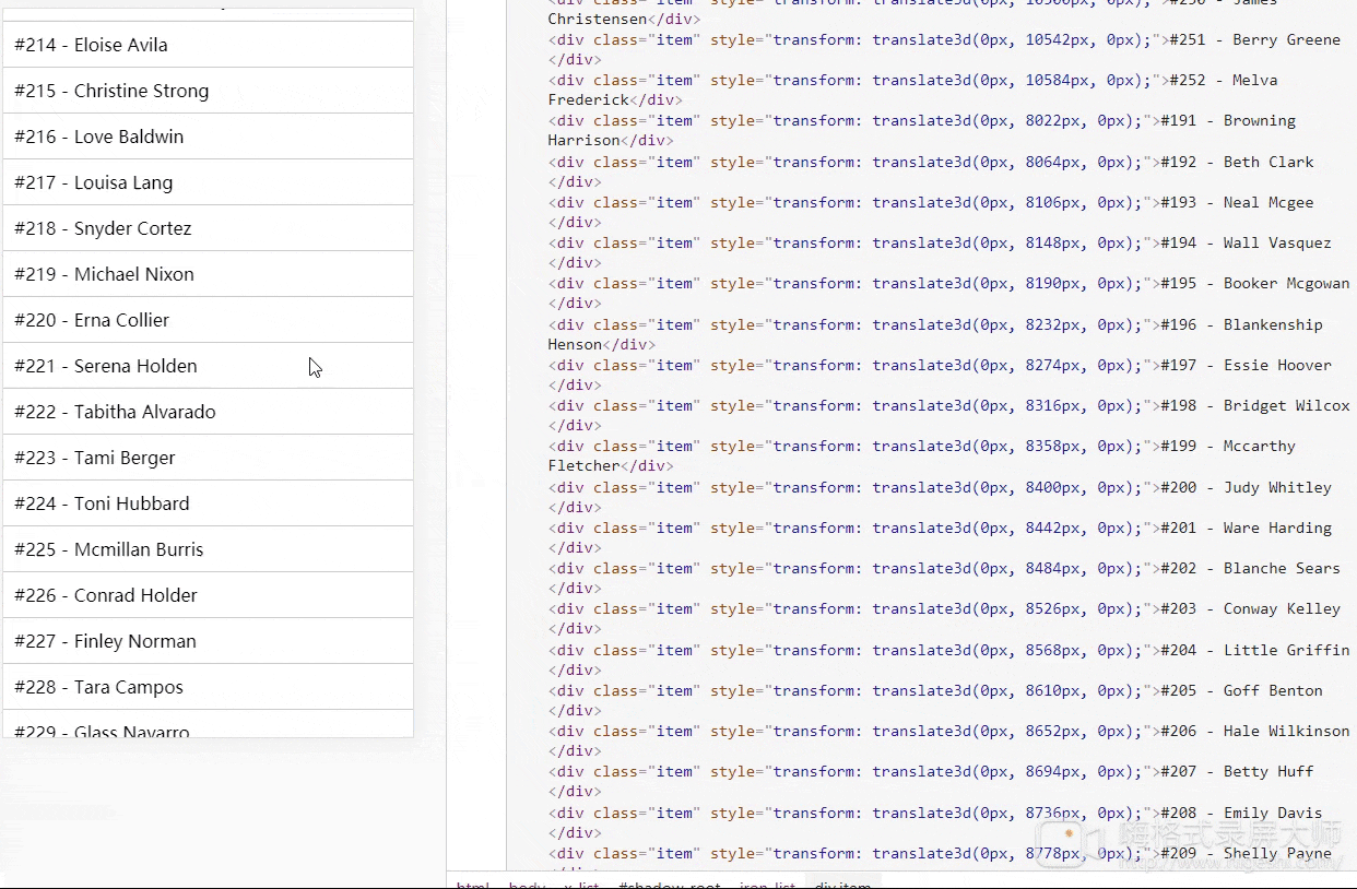 實(shí)現(xiàn)一個(gè)組件,可以顯示具有5個(gè)元素的固定窗口大小的n個(gè)項(xiàng)目的列表: 即在任何時(shí)候,無(wú)限滾動(dòng)n元素上也僅存在5個(gè)DOM容器。
