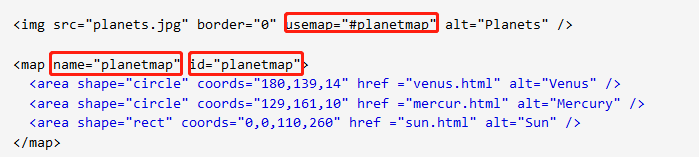 注:<img> 標(biāo)簽中的 usemap 屬性與 <map> 元素 name 屬性相關(guān)聯(lián),創(chuàng)建圖像與映射之間的聯(lián)系。<img> 中的 usemap 屬性可引用 <map> 中的 id 或 name 屬性(由瀏覽器決定),所以我們需要同時(shí)向 <map> 添加 id 和 name 兩個(gè)屬性。