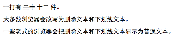 - <p>一些老式的瀏覽器會把刪除文本和下劃線文本顯示為普通文本。</p>