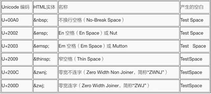 以下是 Unicode 中有 HTML 實體形式的空格及其產(chǎn)生的空白的效果: