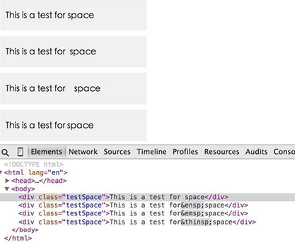例如,"This is a test for non-breaking space" 這個句子,如果單詞之間的空格都使用半角空格,并把它置于一個寬度剛好不足的容器中時,"space" 這個單詞會因為寬度不足而單獨(dú)換行了。
