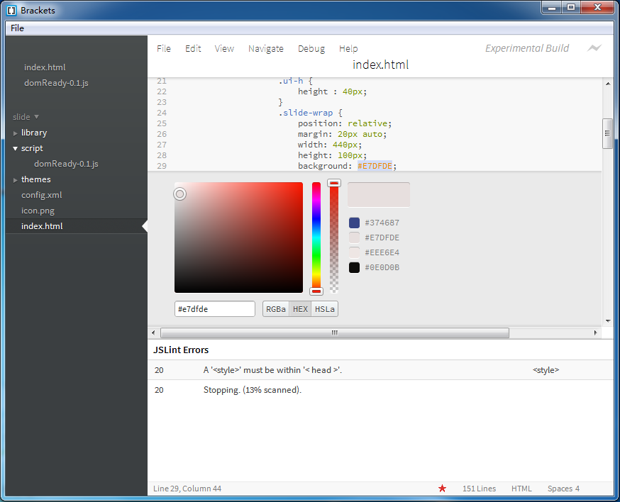4、Brackets內(nèi)建取色器,提供RGBa、HEX、HSLa的顏色編碼形式。把光標(biāo)放在一個(gè)顏色編碼上,按下Ctrl/Cmd + E(“編輯”),退出取色器窗口需要使用Esc鍵。