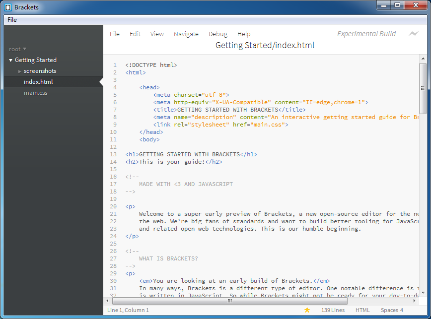 1、打開(kāi)Brackets,整個(gè)界面很簡(jiǎn)潔,頂部菜單欄只提供file > exit退出編輯器功能。左側(cè)為項(xiàng)目組織結(jié)構(gòu)的文件樹(shù),使用Ctrl/Cmd+Shift+H可以呼出與關(guān)閉文件樹(shù)。右側(cè)為編輯區(qū),上部為工具欄,中部為文檔區(qū)域,下部為提示區(qū)域。