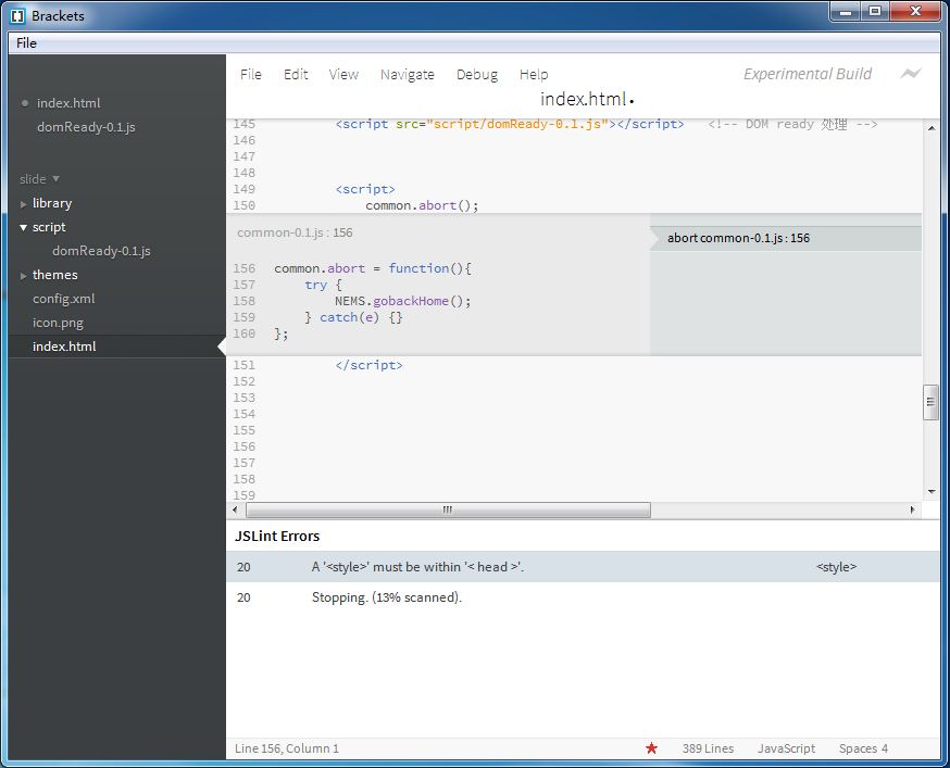3、Brackets同樣支持對(duì)JS對(duì)象定義的快速預(yù)覽/編輯,把光標(biāo)放在一個(gè)js函數(shù)名稱(chēng)上,按下Ctrl/Cmd + E(“編輯”)或退出編輯。