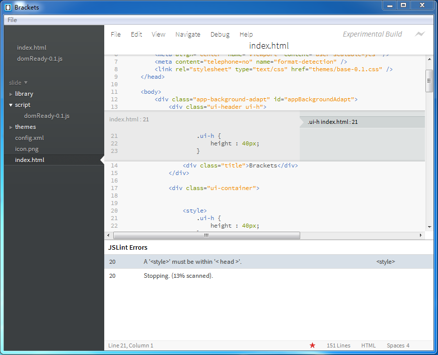 Brackets提供網(wǎng)頁(yè)即時(shí)預(yù)覽功能。使用該功能時(shí),Brackets調(diào)用Chrome瀏覽器打開(kāi)當(dāng)前頁(yè)面,此后修改html、css、javascript并保存后,所修改的內(nèi)容會(huì)即時(shí)響應(yīng)到瀏覽器中的頁(yè)面,無(wú)須手動(dòng)刷新頁(yè)面。這是Brackets最大的一個(gè)亮點(diǎn),有兩個(gè)顯示器的coder有福了,可以分屏顯示Brackets和chrome,即時(shí)修改即時(shí)預(yù)覽,無(wú)需切換編輯器/瀏覽器和刷新頁(yè)面。