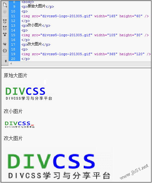 我們在html源代碼中分別插入三張圖片,一張原始大、一張將寬度高度改小小、一張將寬度高度改大。