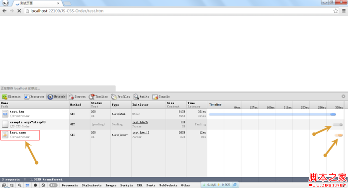 從上圖中可以看出,test.htm 文檔已經(jīng)加載完成,頁面上還沒有顯示任何東西,example.css處于pending狀態(tài),但是,位于最底部的last.js卻加載完成了。這說明chrome進(jìn)行了預(yù)加載,提前下載,放在了瀏覽器的緩存里了。雖然last.js已經(jīng)加載完成,但是還沒有被執(zhí)行,因?yàn)樗懊娴臉邮轿募?huì)阻塞腳本的執(zhí)行。