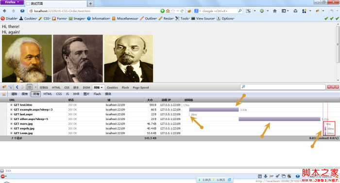 經(jīng)過測(cè)試,發(fā)現(xiàn)在火狐和Opera中,結(jié)果和測(cè)試一的一樣,而在Chrome中稍微有些不同,在測(cè)試一中,圖片要等到head中樣式文件加載完之后才會(huì)下載,但是測(cè)試二中會(huì)和樣式文件并行下載,如下圖: