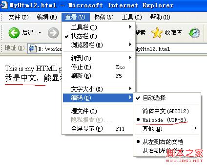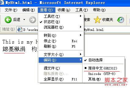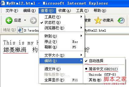 4. 如果瀏覽器中顯示亂碼,但是頁面源文件不是亂碼,可以通過修改瀏覽器的編碼方式看到正確的中文,如果在源文件中設置了正確的"charset",就不需要修改瀏覽器的編碼方式了。