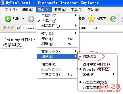 查看瀏覽器的編碼方式,可以看到瀏覽器自動選擇了"UTF-8"方式,并且沒有出現(xiàn)亂碼。