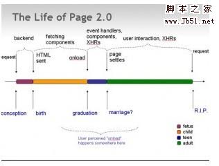 以上是一張web2.0頁面的生命周期圖。工程師很形象地講它分成了“懷孕,出生,畢業(yè),結(jié)婚”四個(gè)階段。如果在我們點(diǎn)擊網(wǎng)頁鏈接的時(shí)候能夠意識(shí)到這個(gè)過程而不是簡(jiǎn)單的請(qǐng)求-響應(yīng)的話,我們便可以挖掘出很多細(xì)節(jié)上可以提升性能的東西。今天聽了淘寶小馬哥的一個(gè)對(duì)yahoo開發(fā)團(tuán)隊(duì)對(duì)web性能研究的一個(gè)講座,感覺收獲很大,想在blog上做個(gè)分享。