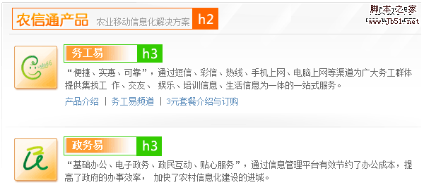 農(nóng)信通產(chǎn)品首頁用到的H標(biāo)簽,不僅有清晰的層級關(guān)系,而且突出了產(chǎn)品內(nèi)容的重要性,對搜索引擎來說也非常有利。
