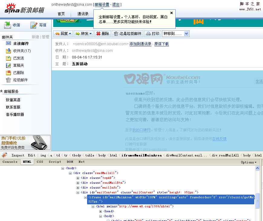 第二類,包括163、sina,這類郵箱,郵件內(nèi)容被布局在獨(dú)立的iframe中。如圖: