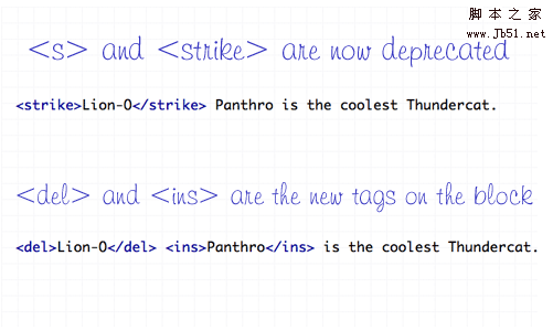在昔日,<S>和<strike>允許用來定義網(wǎng)站文字。不過,現(xiàn)在他們被定義為不推薦使用的標簽,當他們任然可以有效 果.現(xiàn)在用新的標記集- <del>和<ins>。來替換<s><strike>