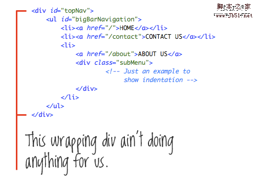 在上圖的例子中,我們使用了一個(gè) div (”topNav”) 來(lái)包含了UL列表 (”bigBarNavigation”). 但DIV和UL都是區(qū)塊元素,所以沒(méi)有必要使用DIV來(lái)包裹UL元素。