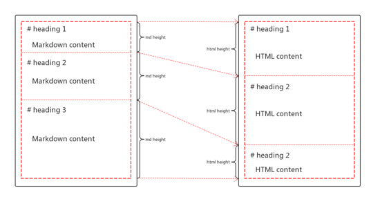 同步滾動(dòng)的實(shí)現(xiàn)方式有很多種。簡(jiǎn)單粗暴的就直接讓 HTMLElement.scrollTop 相等,還有就是讓滾動(dòng)條等比例滾動(dòng),還有標(biāo)題對(duì)齊的滾動(dòng)(這個(gè)是我在 stackedit 上看到的)。