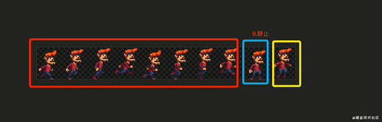 在前面的8個圖像中, 是一個完整的運動過程。第九個畫像是玩家靜止不動的狀態(tài), 第10個畫像是玩家在離地時候的狀態(tài)。因此當玩家移動的時候, 我們需要每60ms切換一幀。當玩家不動的時候繪制第九個畫面, 當玩家跳躍的時候繪制第十個畫面。