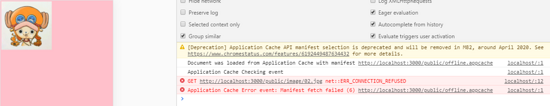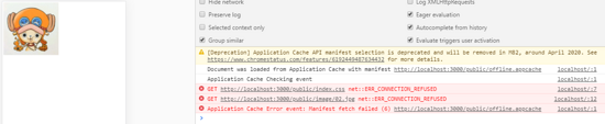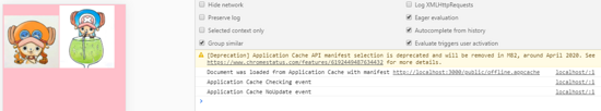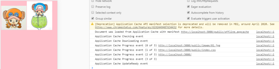 :triangular_flag_on_post: 【注】 看圖右邊控制端的輸出,因為改變了manifest文件,瀏覽器會對比新的 manifest 文件與舊的 manifest 文件,發(fā)現(xiàn)文件改變了,那么就會重新下載文件中的資源并進(jìn)行離線存儲
