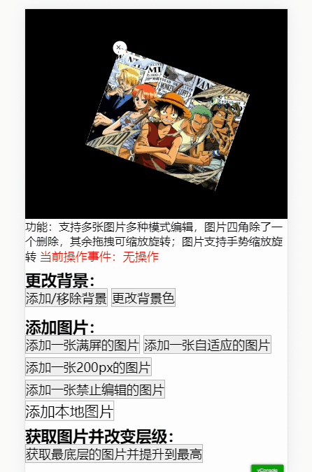 - 插件操作模式支持手勢(shì)放大、旋轉(zhuǎn);支持點(diǎn)擊圖片的四個(gè)角落拖拽放大或旋轉(zhuǎn)或者。