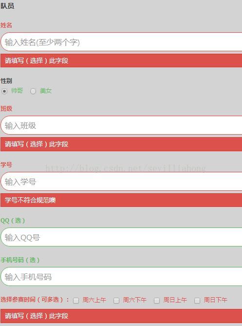 這里的驗證可以根據(jù)需求添加到對應(yīng)字段上,如隊長的QQ、手機(jī)號碼添加驗證而隊員的不用添加。