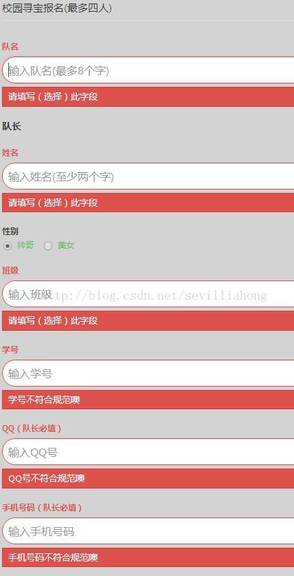 本人是小白,以前做表單驗證都是在提交之前用js檢查一下參數(shù),但這個項目中參數(shù)較多,而且同一字段的校驗方式不同(隊長QQ、手機(jī)必填而隊員不用),若再用之前的方法工作量顯然較大,有沒有更好的方法呢?這時候我看到了amazeUI的js驗證框架,交互效果不錯。