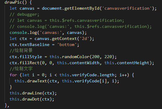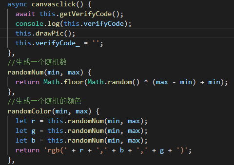 canvasclick 方法用于 當(dāng)用戶辨認(rèn)不清驗(yàn)證碼,或者輸入錯(cuò)誤重新輸入時(shí),點(diǎn)擊 換一個(gè) 即可更新驗(yàn)證碼(此時(shí)要重新從后臺(tái)獲取驗(yàn)證碼) 后臺(tái)小哥哥不打烊吶~~~