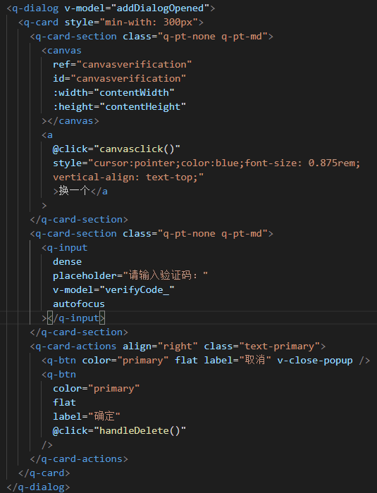 如圖代碼是彈框代碼:其中 canvas 標(biāo)簽上的 ref 是多余的,抱歉吶,忘記刪掉了