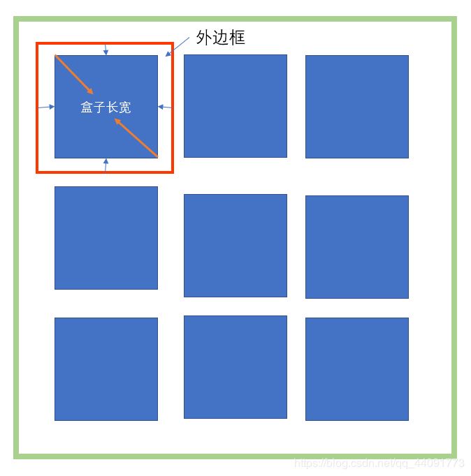 上圖是一個九宮格示意圖,現在我們把它想象到一個網頁中(想象不到就看上圖圖片~~),在網頁中這個布局由最外層綠色的大的div標簽包裹,在綠色的div標簽中有許多藍色的小的div標簽作為綠色div標簽的子級元素組成,這樣簡單的嵌套就完成了。由于我們的目標元素是藍色的小div,那么我們無可避免的要對其設置盒子大小,以及外邊距等等。但是我們操作的對象就是盒子的大小+外邊距(也就是上圖中紅色框選的區(qū)域)。