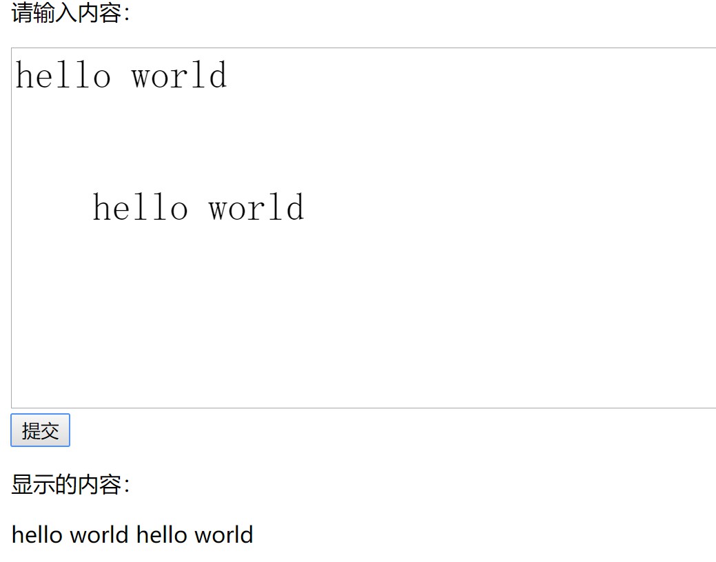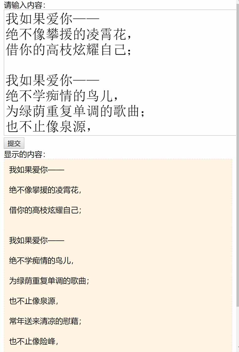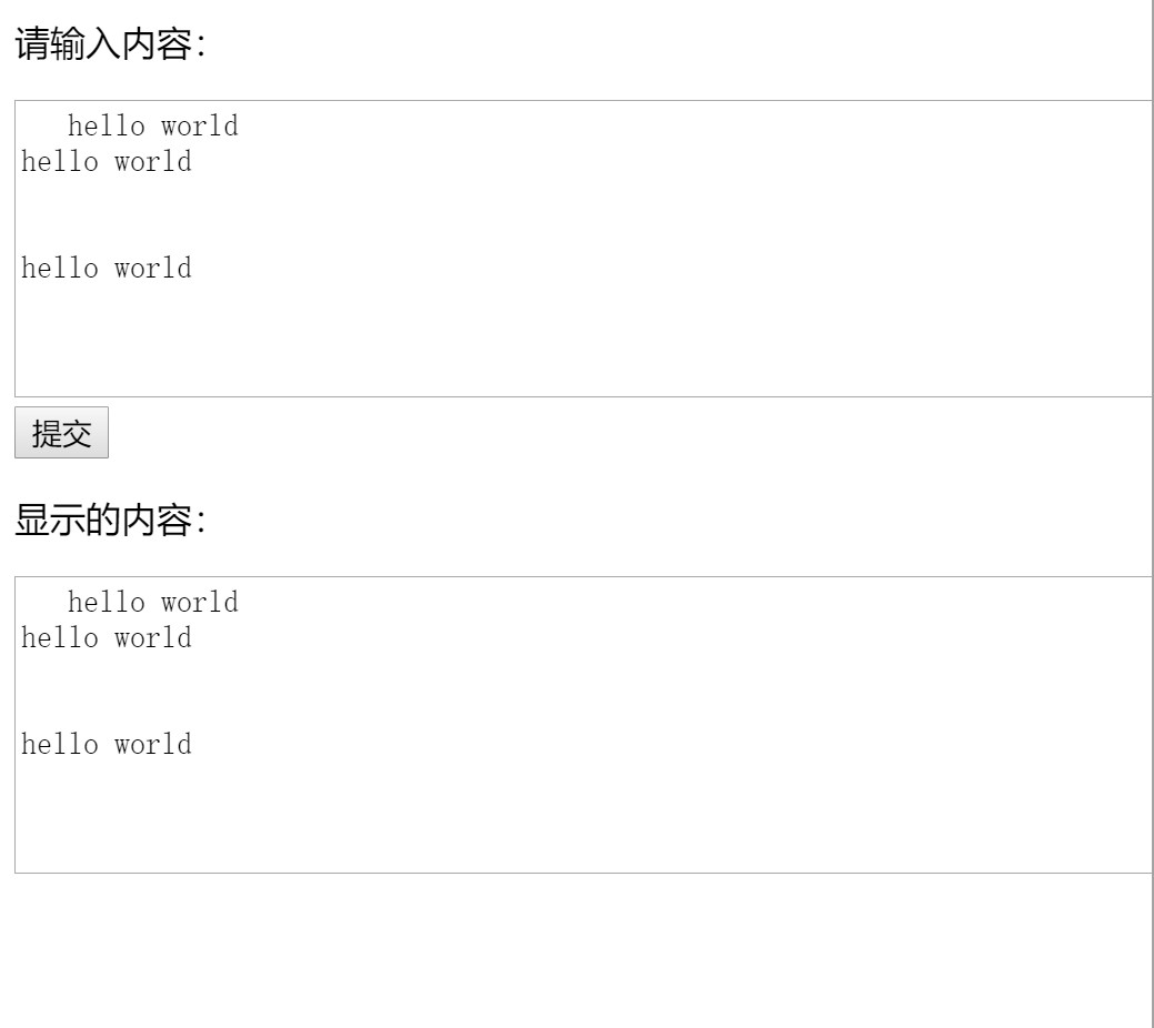 將 div 替換成 pre 標(biāo)簽,將提交的文本顯示在 pre 標(biāo)簽里面。pre 元素可定義預(yù)格式化的文本。被包圍在 pre 元素中的文本通常會(huì)保留空格和換行符,他比較常見的應(yīng)用就是用來顯示代碼,在技術(shù)網(wǎng)站和博客的頁面里面,pre 標(biāo)簽都是用來包裹代碼塊的。