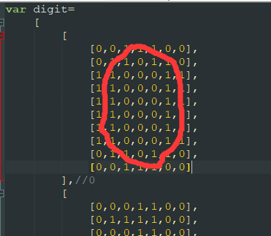 下面導入素材,digit.js,素材中通過二維數(shù)組拼成一個個數(shù)字,共有:0-9和冒號,十個字符,如下: