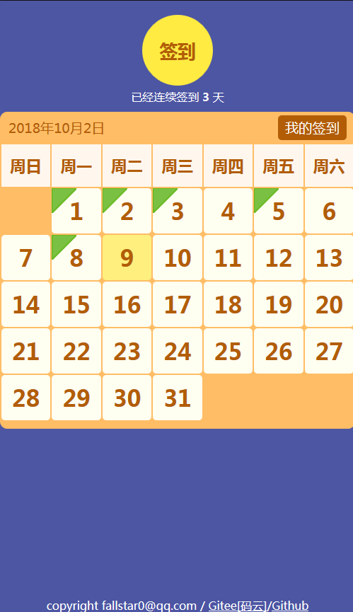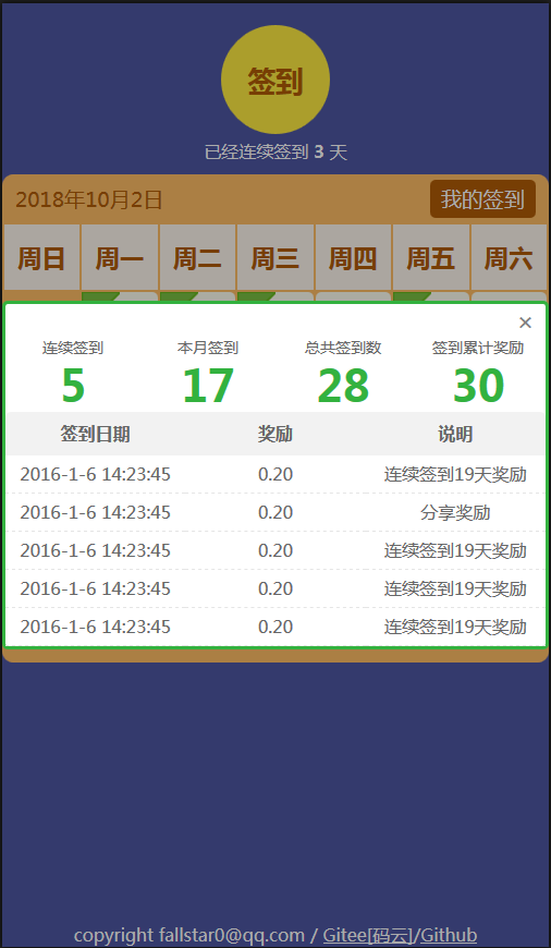 用戶簽到的H5例子(css+jquery,無圖片),由于網(wǎng)上找的的用戶簽到例子都不好,要不就是好多圖片組成的,要不就大量冗余代碼,所以特意做了個(gè)簽到界面(移動端)。
