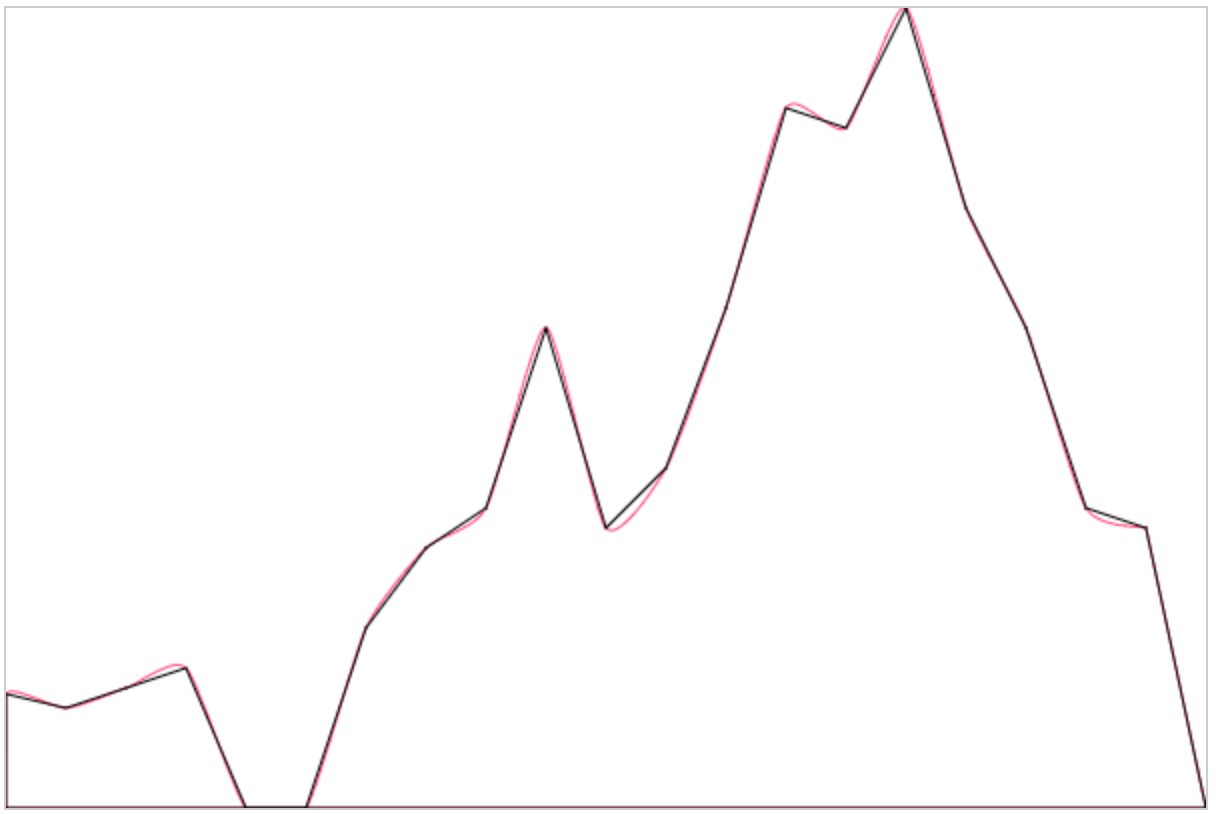 所以在將折線換成平滑曲線的時(shí)候,將邊界值以及其他控制點(diǎn)計(jì)算好之后代入到貝塞爾函數(shù)中就完成了: