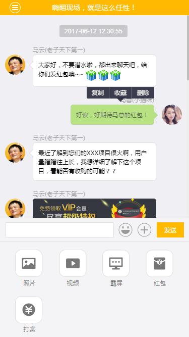 這幾天使用H5開發(fā)了一個仿微信聊天前端界面,尤其微信底部編輯器那塊處理的很好,使用HTML5來開發(fā),雖說功能效果并沒有微信那么全,但是也相當(dāng)不錯了,可以發(fā)送消息、表情,發(fā)送的消息自動回滾定位到底部,另外可以對消息、圖片、視頻有不同的右鍵處理提示,還有打賞、占屏等操作。