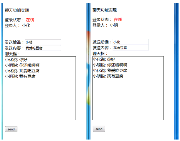 聊天框:<div id="message" style="height: 250px;width: 280px;border: 1px solid; overflow: auto;"></div>