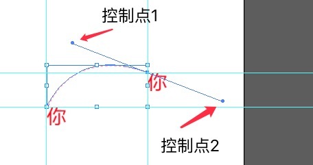 然后選擇鋼筆工具, 先后在起點(diǎn)和終點(diǎn)處點(diǎn)擊, 在點(diǎn)擊終點(diǎn)后鼠標(biāo)不要松開(kāi), 直接拖動(dòng)AI會(huì)自動(dòng)添加2個(gè)控制點(diǎn). 通過(guò)移動(dòng)鼠標(biāo)可以調(diào)整兩個(gè)控制點(diǎn)的位置, 從而達(dá)到調(diào)整鋼筆工具所生成的路徑的目的, 直到和設(shè)計(jì)稿上的參考線(xiàn)路徑一致.如下所示: