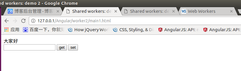 這里分析一波,我們?cè)趍ain1.html的文本框輸入數(shù)據(jù),點(diǎn)擊set,然后在main2.html中點(diǎn)擊get法現(xiàn)能夠獲取到我們?cè)趍ain1.html中設(shè)置的數(shù)據(jù),這說(shuō)明我們的sharedWorker事實(shí)上是單例的,就像java中的static類一樣,不管new多少個(gè),實(shí)際上只有一個(gè),這樣我們的不同線程就可以共享到sharedWorker中的數(shù)據(jù)了。這里把圖給上,記得有篇文章沒(méi)給圖,然后有人給我建議了,問(wèn)能不能給圖。