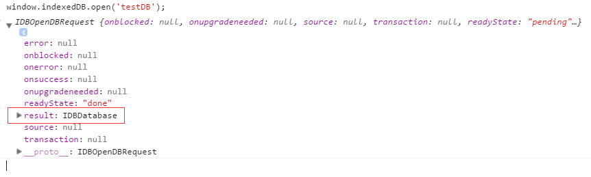 在IndexedDB大部分操作并不是我們常用的調(diào)用方法,返回結(jié)果的模式,而是請(qǐng)求——響應(yīng)的模式,比如打開數(shù)據(jù)庫的操作
