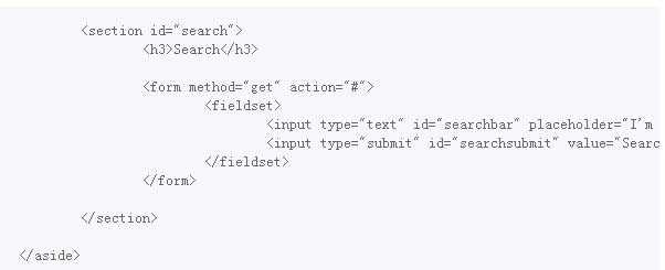 本示例中aside元素中包含了若干個section元素。在側(cè)邊欄的底部有一個簡單的搜索框。它可以讓我們接觸到HTML5表單的一些新特性。