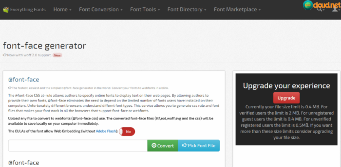 這個(gè)生成器可以讓你上傳網(wǎng)頁上的字體或是系統(tǒng)里面的字體。然后生成一個(gè)可以拿來用的輸出文件。這個(gè)生成器給字體屬性生成了一個(gè)CSS文件,然后字體就可以顯示在HTML文件里了。這是一個(gè)非常好的檢查字體工具,尤其是你沒有足夠的時(shí)間去創(chuàng)建一個(gè)使用許多重復(fù)性字體的完整的網(wǎng)站時(shí)候。