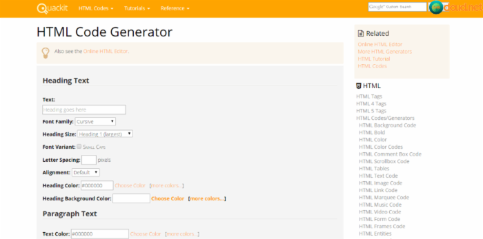 Quackit 不僅可以給你提供一系列的代碼,還允許你輸入你的所有信息。這對初學(xué)者非常有幫助。所以,如果一開始你學(xué)的是CSS和HTML,你就可以用這個(gè)生成器來簡化你的工作任務(wù)了。這些生成器可以說是非常棒的,因?yàn)樗鼈儗W⒂趫A角邊框,陰影,顏色漸變以及和html5模板的設(shè)計(jì)。